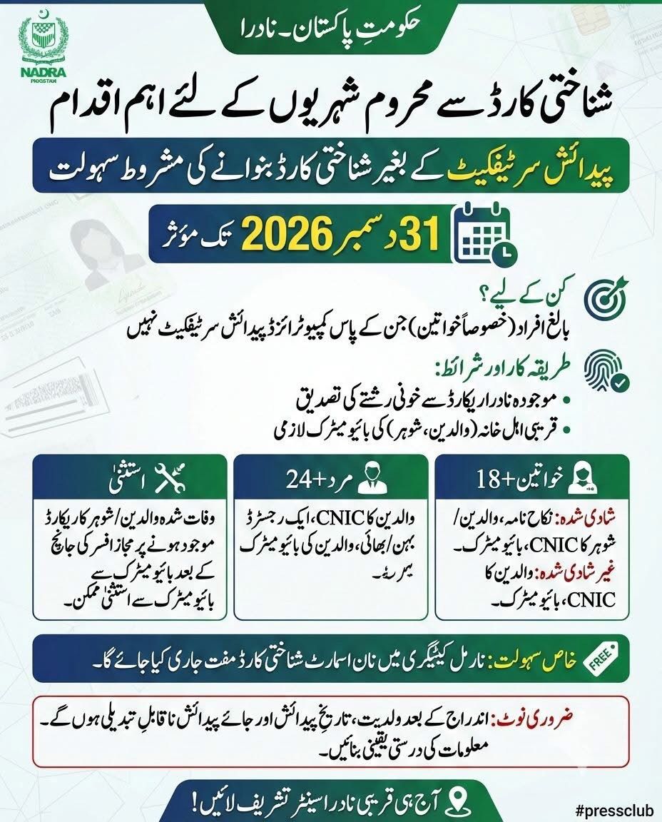 سرکاری سکولوں کو ایک دفعہ پھر فروخت کرنے کے لیے اشتہار جاری کر دیا گیاپیدائش سرٹیفکیٹ کے بغیر شناختی کارڈ بنوانے کی مشروط سہولت پہلی بار رجسٹریشن کے لئے یہ سہولت 31 دسمبر 2026 تک مؤثر متبادل طریقوں سے درخواست گزار کی شناخت کی…